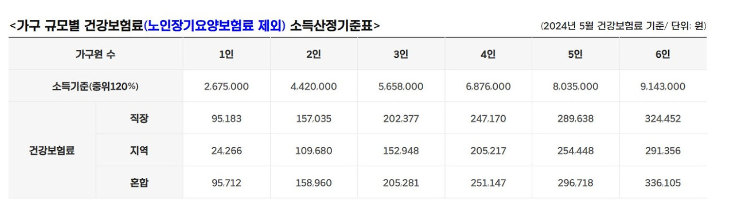 - 기준중위소득 120% 이하의 가구에 해당하며 24년 5월 건강보험료를 기준으로 합니다.