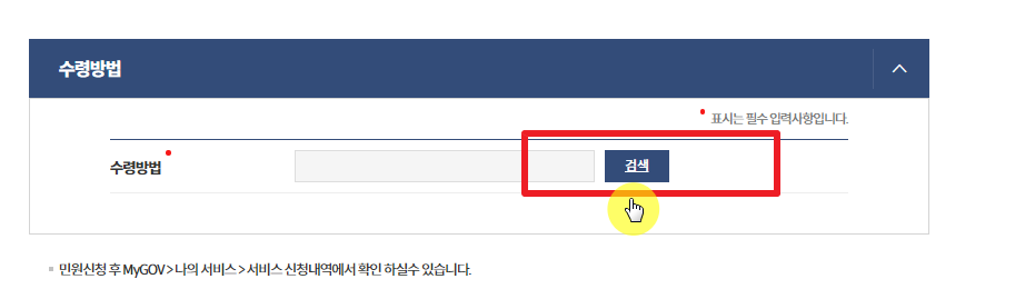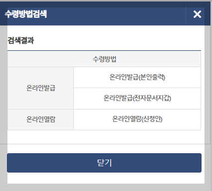 수령방법에서 검색버튼을 클릭하면 아래와 같은 '수령방법검색' 새창이 뜹니다.