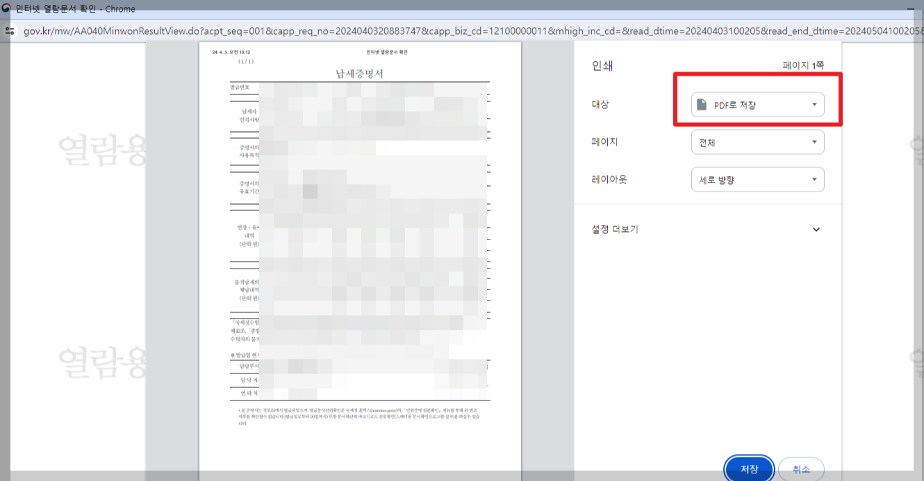 인터넷 열람문서도 출력 혹은 저장이 가능합니다.