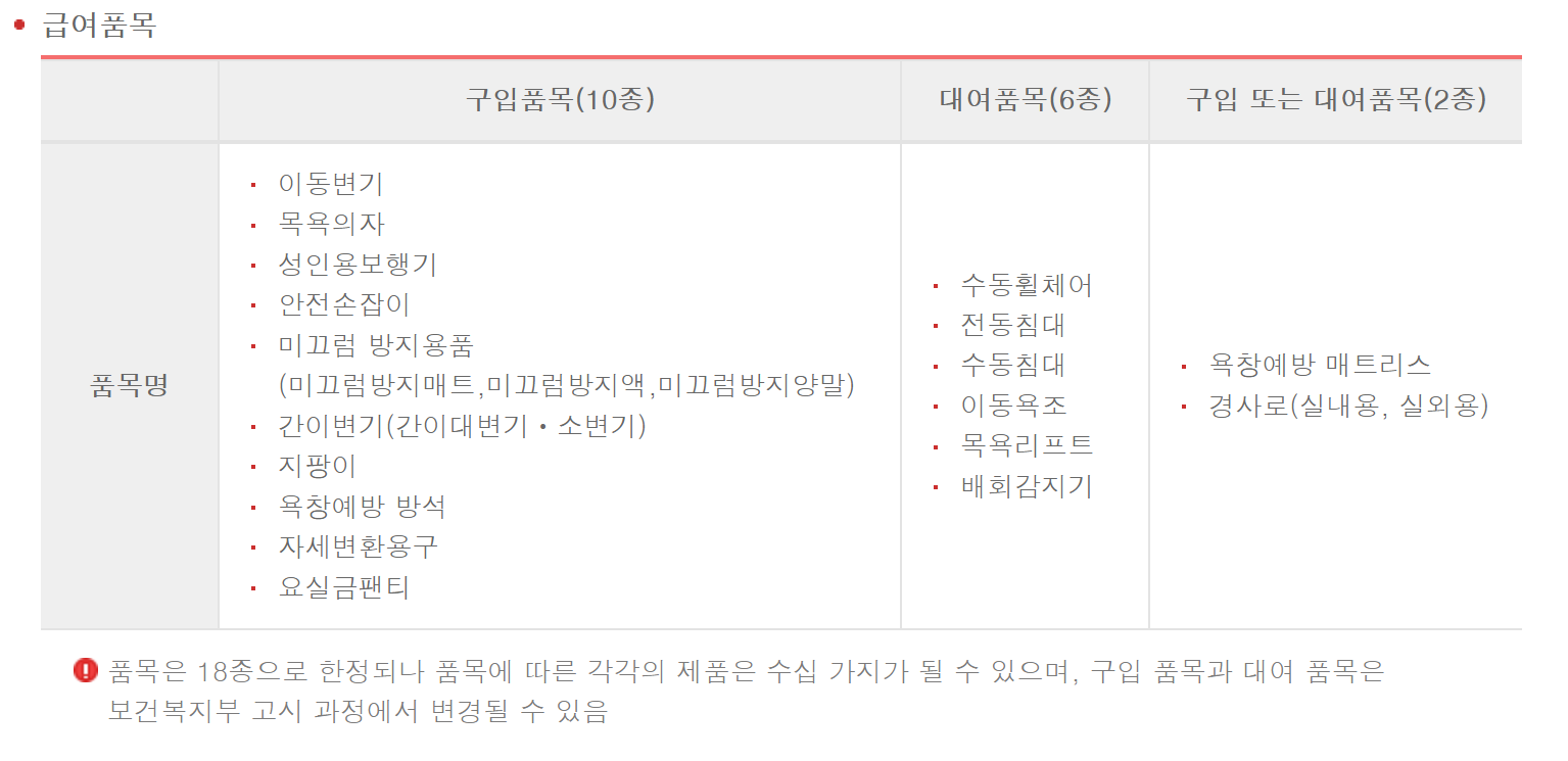 구입가능한 품목은 이동변기, 목욕의자, 성인용 보행기, 안전손잡이, 미끄럼 방지용품, 간이변기, 지팡이, 욕창예방방석, 자세변환도구, 요실금 팬티 등 총 10개 품목입니다.