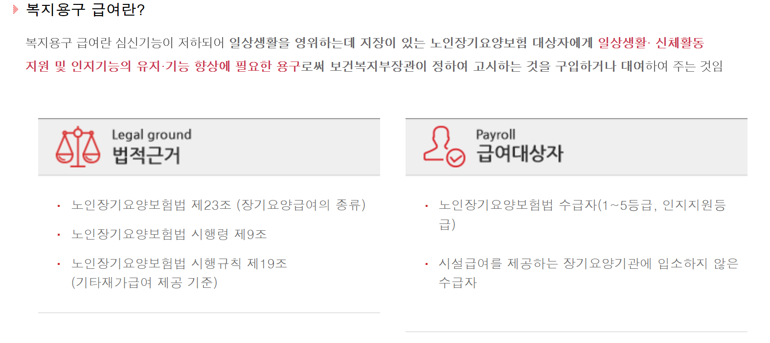 복지용구 급여란? 복지용구 급여란 심신기능이 저하되어 일상생활을 영위하는데 지장이 있는 노인장기요양보험 대상자에게 일상생활· 신체활동지원 및 인지기능의 유지·기능 향상에 필요한
