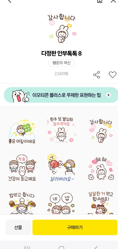 카톡 이모티콘을 구매하여 내가 사용할 수도 있지만 다른 사람에게 선물할 수도 있습니다.