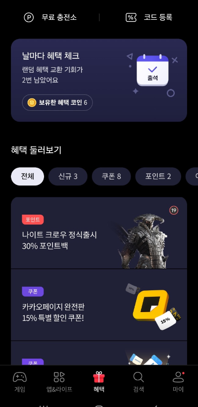 '혜택'을 눌러서 나오는 화면에서 '날마다 혜택 체크'를 누르면 나오는 화면에서 달력 밑에 있는 '오늘의 혜택 받기'를 누르면 오늘의 코인이 쌓이게 됩니다.